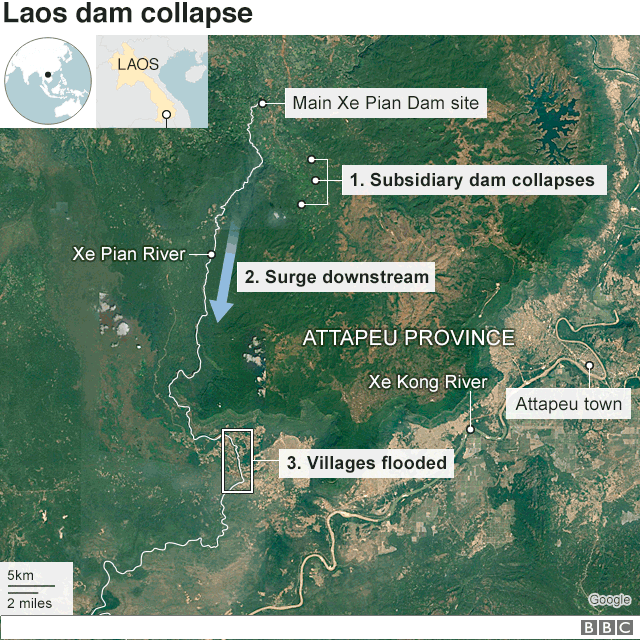 The dam that collapsed is part of the Xe-Pian Xe-Namnoy hydroelectric power project, which involves Laotian, Thai and South Korean firms.